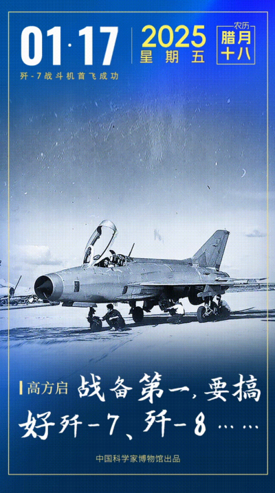 1966年1月17日,我国自行研制的第一架两倍音速战斗机“歼-7”在沈阳首飞成功。