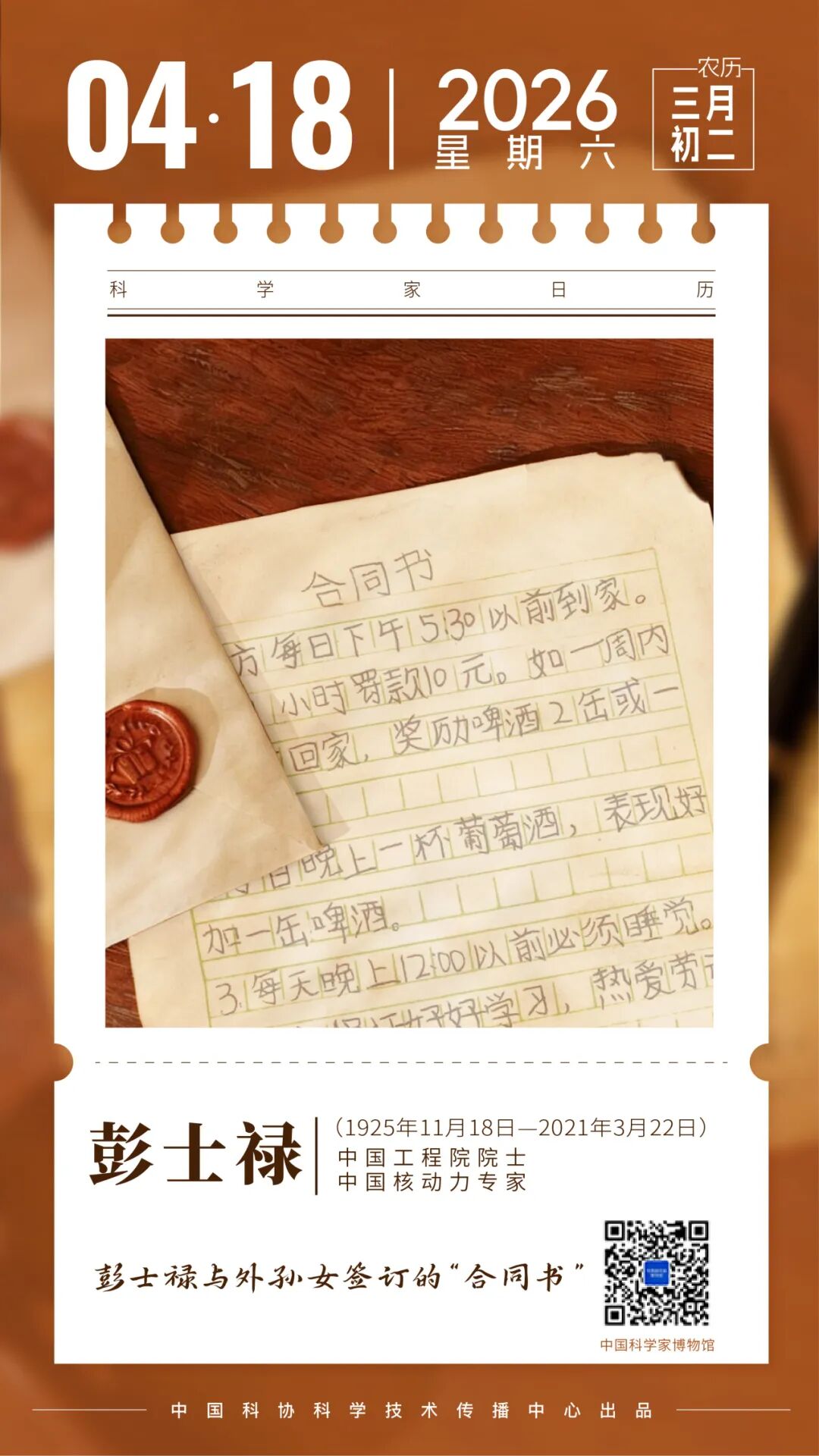11月18日,在彭士禄同志诞辰百年之际,为弘扬科学家精神,纪念彭士禄同志的突出贡献,中国科协、中核集团联合主办的“中国核动力事业的拓荒牛——纪念彭士禄院士诞辰百年”主题展在中国科学家博物馆开展。中国科协党组成员、书记处书记王进展,中核集团党组副书记、董事刘建平出席开展仪式并致辞。彭士禄,中国工程院院士,是中国第一代核潜艇首任总设计师,中国核动力事业的开拓者与奠基人。信件