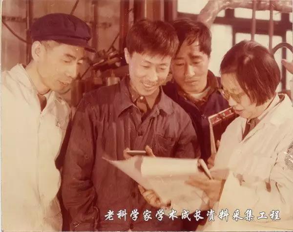 1983年6月,安静娴(左二)与研究院全体工程师在东北制药总厂讨论工作