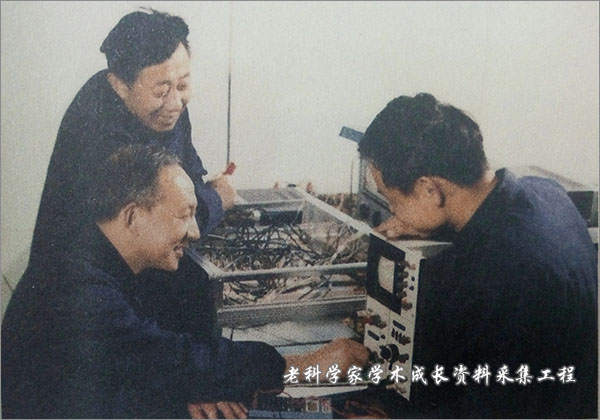 1988年,电子学家保铮(前左)在西安电子科技大学与学生一起研制雷达信号处理器。