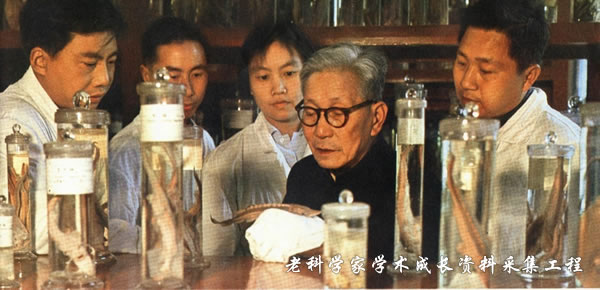 1960年曹文宣(左1)在标本室与同事一起向伍献文先生学习的照片。