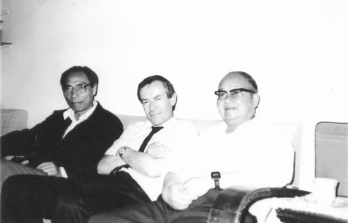 ③1990年,龚昌德(左)与冯端(右)于南京接待联邦德国萨尔州立大学Holz教授(中)。