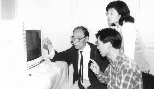④1994年,龚昌德(左一)与博士后李建新(左二)、李美蓉(女)于南京大学办公室讨论学术问题。