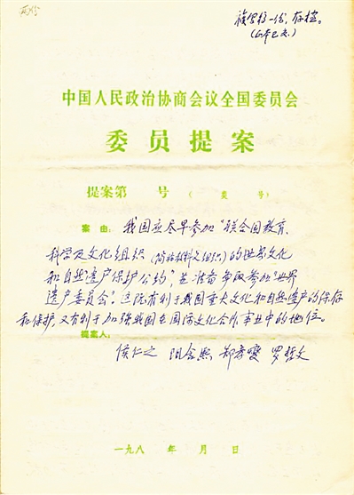 就在聚焦经济发展的一众提案中,一份如今已经泛黄的聚焦文化保护与传承的提案得到了国家的重视和采纳。这份提案的内容分外鲜明:尽早参加《保护世界文化和自然遗产公约》,争取参加世界遗产委员会!
