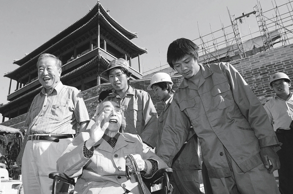 2004年9月1日,93岁高龄的侯仁之(左二)第一次登上了复建总体竣工的永定门城楼