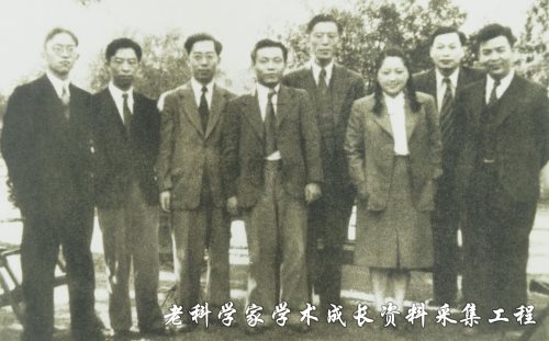 部分中国物理学家在剑桥合影(左起胡济民、梅镇岳、胡宁、彭桓武、周培源、何泽慧、钱三强、吴大猷)