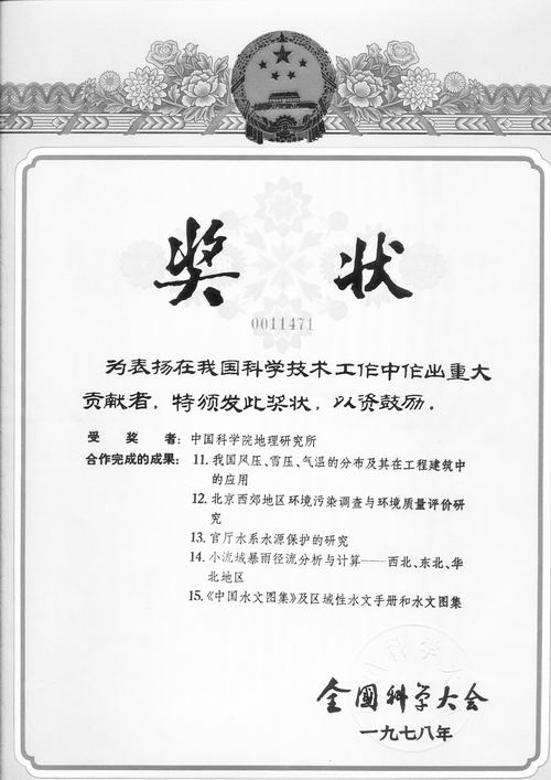 1978年,中国科学的春天来临,小流域暴雨洪峰流量计算方法获得全国科技大会奖。