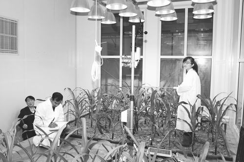 ④2013年12月27日,刘昌明指导博士生吴亚丽和沙凯在地理资源所的五水转化动力学装置做玉米生长对环境条件改变的响应实验。