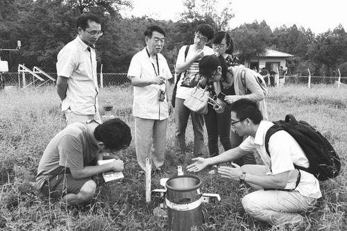 ⑤2014年9月11日,刘昌明(左三)在保定易县水土保持试验站给学生讲述降雨的测量。