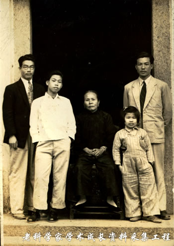1949-1950期间,马育华母亲马周随芸在香港暂居,与二儿子马育仑、三儿子马育壮、小儿子马育强、侄孙女马婉贞合影。