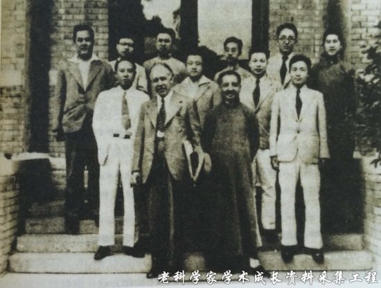 在北平研究院同玻尔(前排左)合影(二排右二为钱三强)