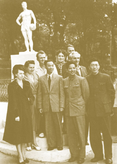 1958年原苏联考察跃进号万吨轮时与设计人员在一起(前排右一为许学彦)