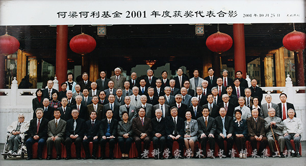 2001年10月,何梁何利基金2001年度获奖代表合影,前排右起:3师昌绪、9朱光亚、10成思危、11朱丽兰。五排左5颜鸣皋。