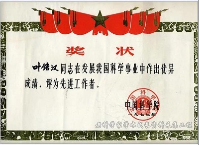 1977年,叶铭汉荣获中国科学院颁发的先进工作者证书