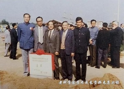 1984年10月,李政道(左三)与叶铭汉(左四)在北京正负电子商务对撞机奠基典礼上
