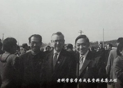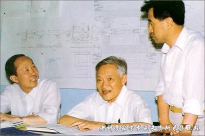 1988年,加速器物理学家谢家麟(左)、叶铭汉(右)与美国能源部法勒教授(中)在北京正负电子对撞机建成典礼上