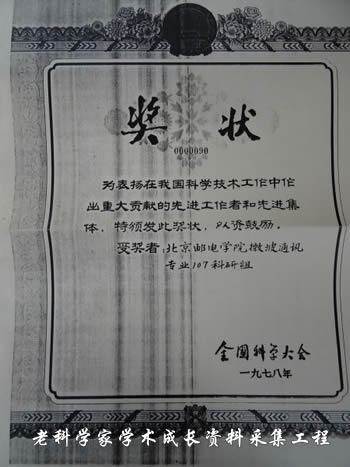 是周先生的团队北京邮电学院微波通信专业107科研组获得科技工作先进工作者和先进集体奖的奖状复印件1份。