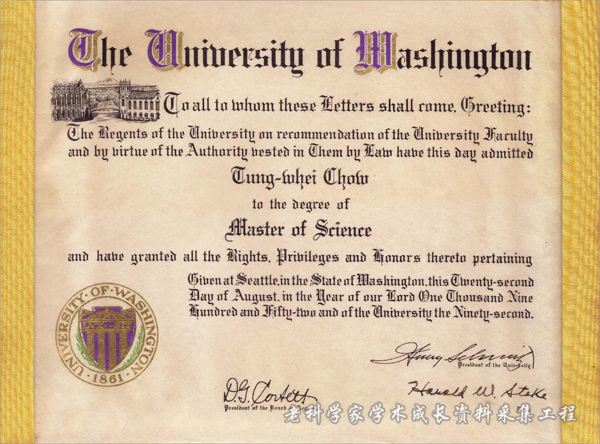 1952年8月,周同惠在美国西雅图华盛顿大学被授予理学硕士学位。