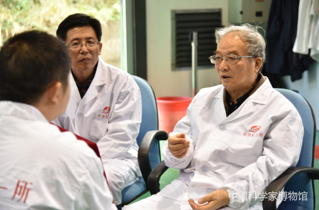 孙承纬(右一)在绵阳流体物理研究所与科研人员讨论