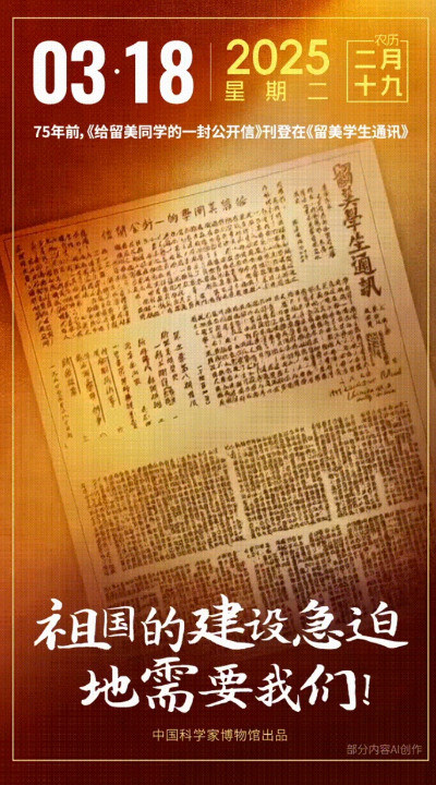 这段铿锵有力的文字,出自75年前朱光亚牵头组织起草的《给留美同学的一封公开信》。如今这封信安静地躺在中国科学家博物馆的展柜里。