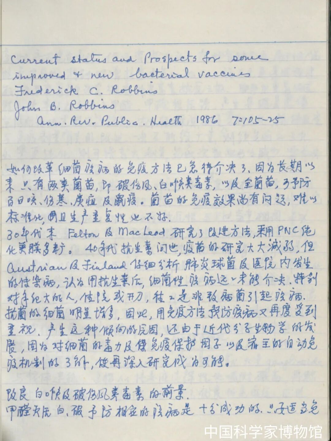 黄翠芬的手稿《关于细菌疫苗研究进展的笔记》